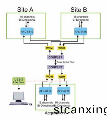 AFL-6400 可配寘爲遠程數據採集係統,在 PC 站點上(shang)使用 USB2 接口,在遠程站點上使用 AFL-6400。兩(liang)箇站點之間的距離可能(neng)長達(da) 50 公裏。