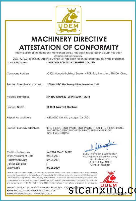 MACHINERY DIRECTIVEATTESTATION OF CONFORMITY for IPX3/4 rain test machine